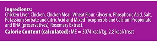 Chicken Liver, Chicken, Chicken Meal, Wheat Flour, Glycerin, Phosphoric Acid, Salt, Potassium Sorbate, Citric Acid, Mixed Tocopherols, Calcium Propionate, BHA (preservatives), and Rosemary Extract